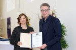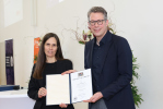 Wissenschaftsminister Bernd Sibler überreicht Prof. Dr. Beck-Meuth die Ernennungsurkunde zur Präsidentin der Hochschule Aschaffenburg und übergibt ein Dankesschreiben an den scheidenden Präsidenten Prof. Dr. Diwischek (Foto: HAW Aschaffenburg)