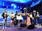 Das Finale des Musikwettbewerbs „Tradition und Moderne“ mit den vier Finalistenteams und den Gewinnern „Zweifel und Caecilia“: Levent Geiger, Annalea Hummel, die Gewinner „Zweifel und Caecilia“ (mit Scheck), „Blaurosa“ (v.l.n.r.)